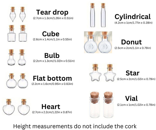10pc Mini Glass vials with cork stopper - various shapes for DIY Jewelry, Party/Wedding favors, Small bottle for Valentine or Magical crafts