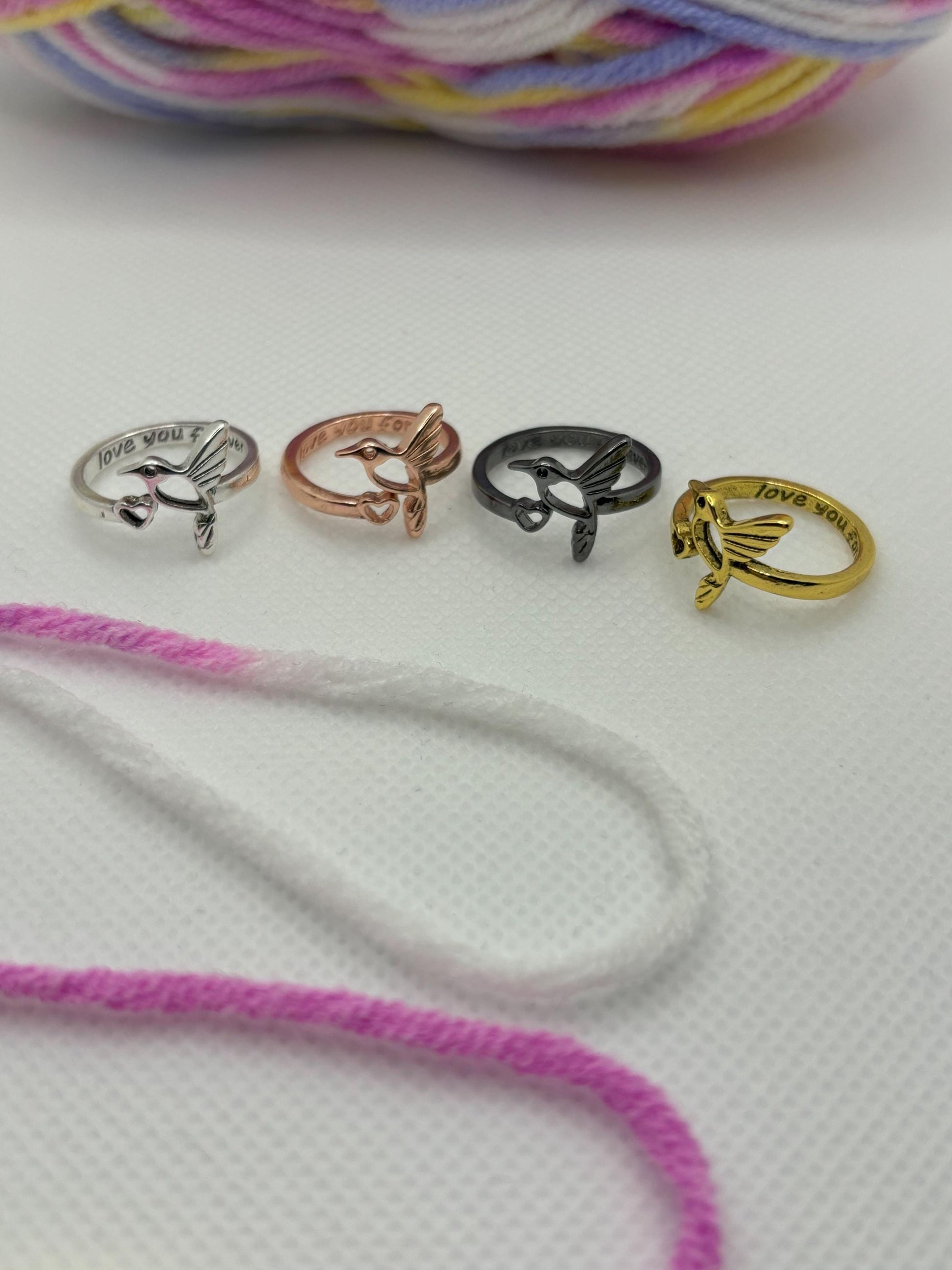 Christmas or Birthday gift for people who like to crochet. Elevate your knitting or crochet experience with our Adjustable Yarn Tension Ring - Bird edition with engraving "love you forever" . This versatile loop and winder ensure precise yarn tension, enhancing your fiber arts projects. Crafted in elegant rose gold, gold, black or silver options, it's the perfect gift for knitters, combining style and functionality seamlessly.