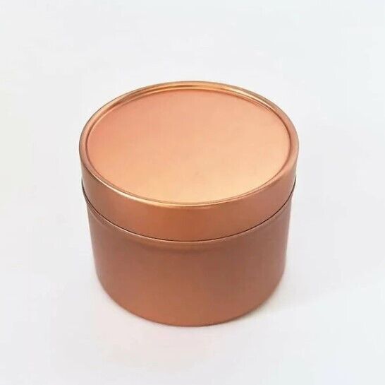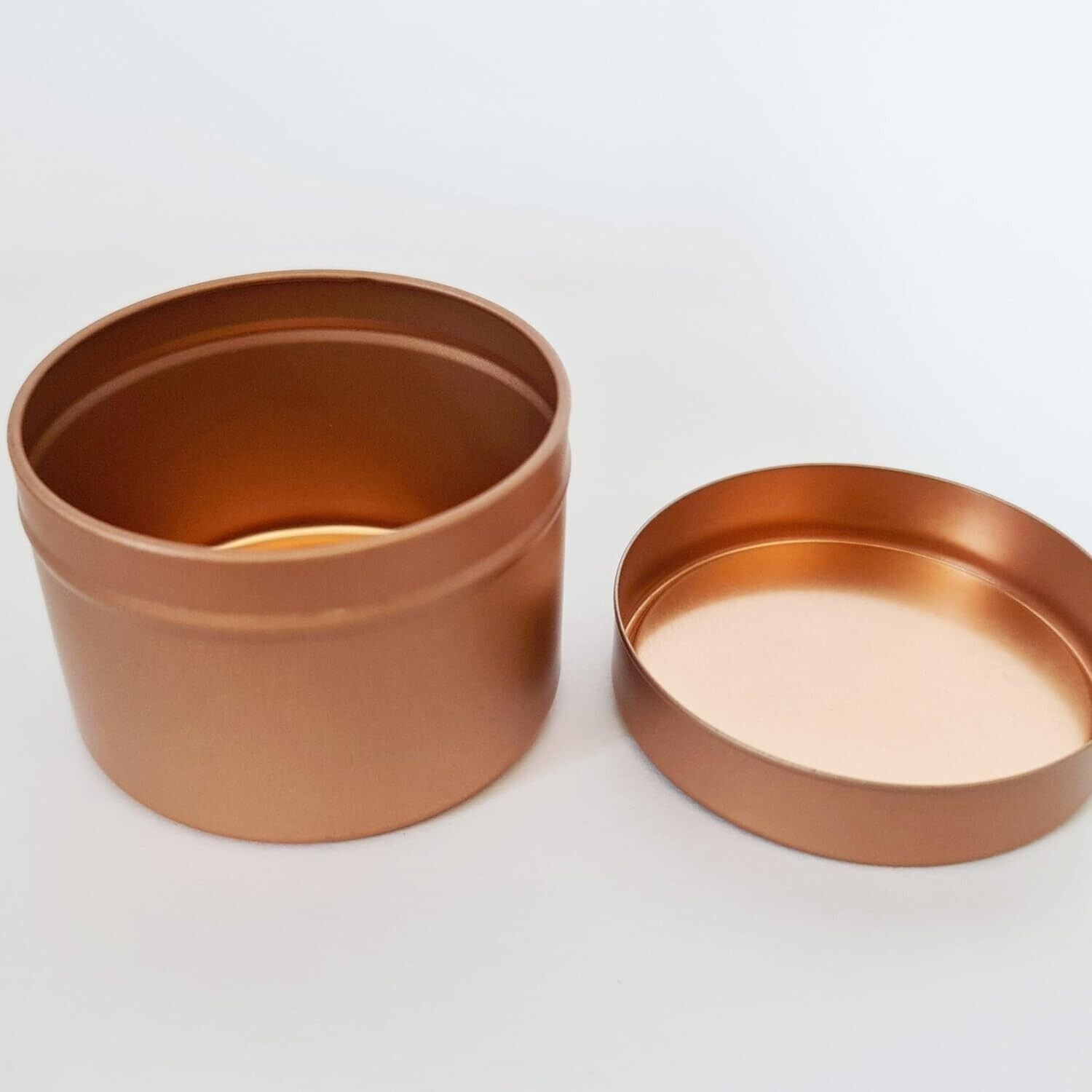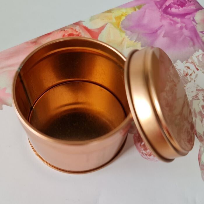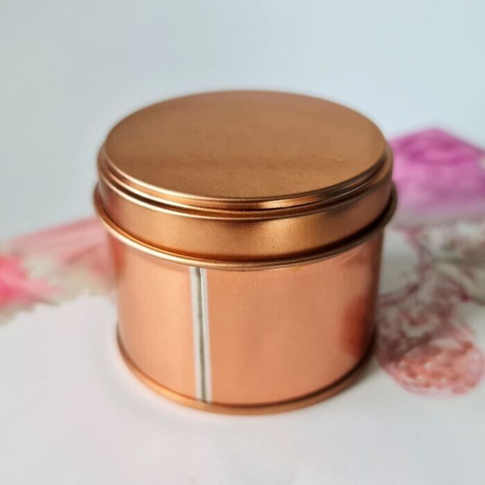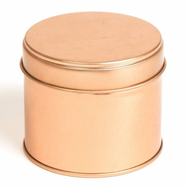 100ml tin in a rose gold finish with a firm push on lid(x15 tins). The lid has a traditional shaped style.