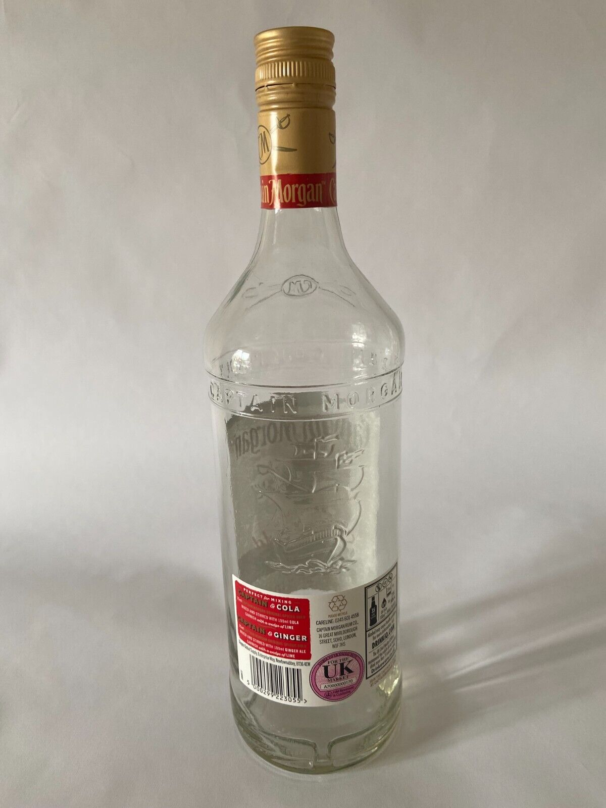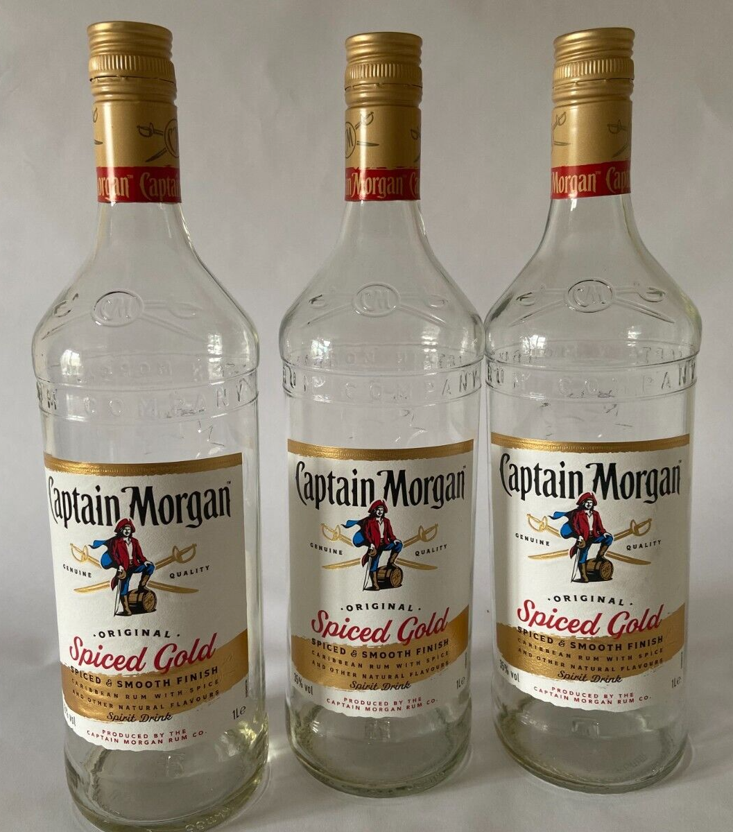 This is a Pack of 3 Captain Morgan Spiced Gold Rum empty glass bottles, each with a capacity of 1 litre/1000ml.
